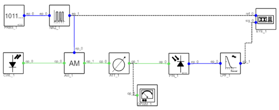 關(guān)于靈敏度, 如下圖所示偽隨機(jī)比特序列(PRBS_1)和不歸零碼(NRZ_1),用于產(chǎn)生隨機(jī)通斷鍵控(OOK)信號(hào)。經(jīng)過(guò)NRZ_1后,一部分信號(hào)發(fā)送給眼圖作為參考信號(hào),另一部分作為接收信號(hào)發(fā)送到光幅度調(diào)制器(AM_1),通過(guò)整個(gè)系統(tǒng)到達(dá)眼圖。連續(xù)波激光器(CWL_1)作為光源發(fā)射到光幅度調(diào)制器的光端口。光衰減器(ATT_1)用于衰減光功率。光功率計(jì)(OPWM_1)用于監(jiān)測(cè)光功率。信號(hào)調(diào)制后,pin探測(cè)器(pin_1)用于將信號(hào)從光信號(hào)轉(zhuǎn)換為電信號(hào)。低通貝塞爾濾波器(LPF_1)用于濾除高頻信號(hào)。最后,利用眼圖分析傳輸信號(hào)的質(zhì)量。