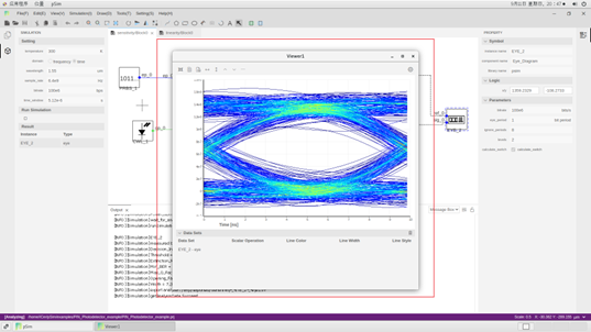 光電探測(cè)器是光接收器的主要器件之一,用來(lái)將光功率轉(zhuǎn)換為電流。根據(jù)系統(tǒng)的性能目標(biāo),可以選用PIN或APD(雪崩光電二極管)光電探測(cè)器。誤碼率(BER)是用于指定通信傳輸系統(tǒng)可靠性的主要指標(biāo),通常與接收機(jī)靈敏度值相關(guān),該值定義了必須到達(dá)光電探測(cè)器的最小平均光功率,以實(shí)現(xiàn)所需的BER性能。另外,信道的Q值可以從采樣的信號(hào)統(tǒng)計(jì)中計(jì)算出來(lái),并用于估計(jì)系統(tǒng)的誤碼率。光電探測(cè)器在定義基本通信系統(tǒng)的最終靈敏度方面起著重要的作用,因?yàn)樗陨椩肼暫蜔嵩肼暤男问教峁┙y(tǒng)計(jì)擾動(dòng),并引入了暗電流及定義響應(yīng)率來(lái)衡量每單位輸入功率獲得多少電輸出。這些特性取決于入射光的波長(zhǎng)和傳感器的材料特性和物理設(shè)計(jì)。讀者可依照本文,用pLogic 搭建鏈路,通過(guò) pSim進(jìn)行鏈路仿真,如下圖,兩者均為國(guó)產(chǎn)EDA軟件 PIC Studio光電融合設(shè)計(jì)全流程的模塊。