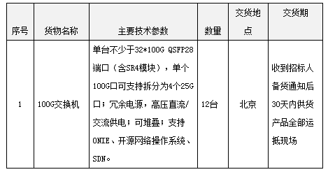 ICCSZ訊 (編輯:Nicole)8月13日,中國電信發(fā)布中國電信云公司2017年研發(fā)測試環(huán)境建設(shè)工程(100G交換機)(重新招標)招標公告(招標編號:09-02-04H-2019-D-A00253C01):根據(jù)業(yè)務(wù)開展及技術(shù)測試驗證的需要,需要搭建研發(fā)測試環(huán)境,實現(xiàn)各項研發(fā)測試環(huán)境測試目標。本期工程新增100G交換機(含光模塊、光纖)12臺,作為網(wǎng)絡(luò)接入交換機,在實際驗證高容量接入交換機使用效果的同時,節(jié)約了機架空間,減小了占地面積,并簡化數(shù)據(jù)中心核心遷移到100 Gbps 的工作。