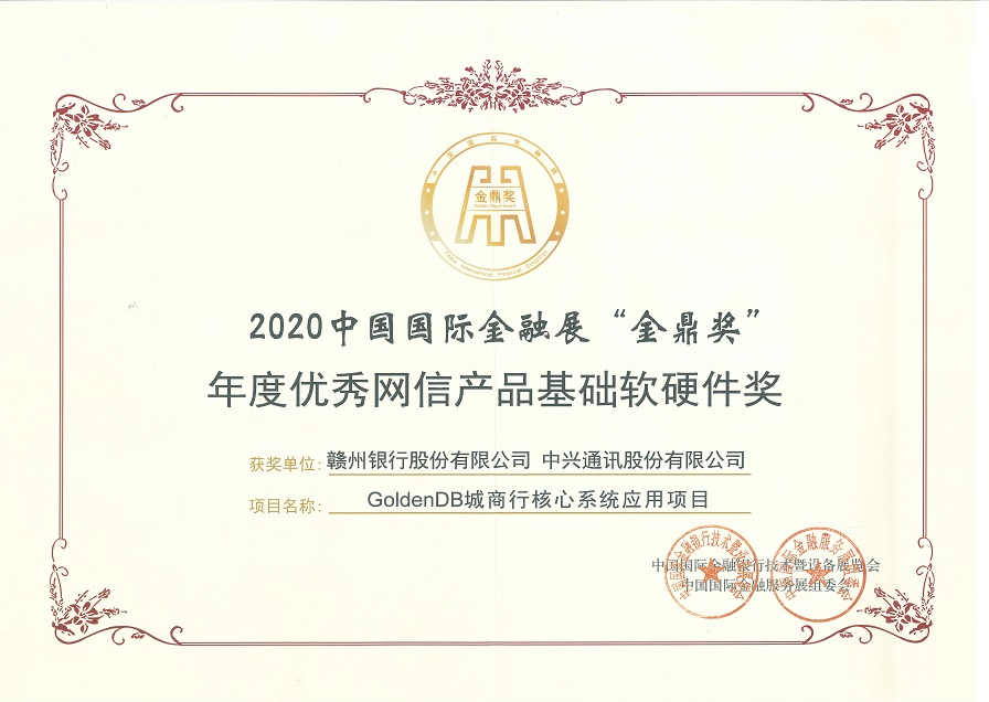 ICC訊 近日,中國國際金融展組委會正式公布2020 “金鼎獎”獲獎單位名單,中興通訊攜手贛州銀行打造的“GoldenDB城商行信貸核心系統(tǒng)應(yīng)用項目”喜獲“年度優(yōu)秀網(wǎng)信產(chǎn)品基礎(chǔ)軟硬件獎”,這是繼2019年攜手中信銀行之后再次獲此殊榮,充分展現(xiàn)了GoldenDB分布式數(shù)據(jù)庫在金融行業(yè)的創(chuàng)新實力。