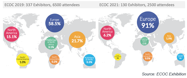 如下圖所示,大多數(shù)美國和日本的大型公司沒有參加或參展ECOC2021,這讓歐洲公司以及一些外國供應商在歐洲的銷售和營銷團隊的知名度得以提高。光迅和海思是此次展會上為數(shù)不多的外國參展商之一,由他們的當?shù)貓F隊做代表。大型參展商的缺席,讓較小的供應商獲得了更多的知名度,其中包括一些不得不跨境參加的供應商。
