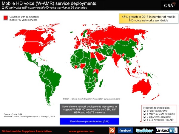 2014年也有望取得更大的進(jìn)展在處理國際高清語音通話,以及固定和移動(dòng)網(wǎng)絡(luò)之間的高清語音呼叫。 GSA預(yù)計(jì),高清語音通話的驚人體驗(yàn)將成為2014年主流的移動(dòng)用戶體驗(yàn)。