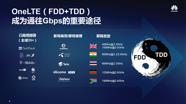 在4.5G發(fā)展過程中,華為還洞悉、發(fā)現(xiàn)了不少趨勢,其中一個即為“OneLTE(FDD+TDD)成為通往Gbps的重要途徑”。——頻譜資源是實現(xiàn)Gbps極致體驗的基礎(chǔ)要求,TDD頻譜的價值日益得到關(guān)注。2015年11月,3香港通過FDD+TDD 4CC載波聚合等4.5G技術(shù)實現(xiàn)了1Gbps的下載速率;如今全球已有超過20張OneLTE商用網(wǎng)絡(luò),且有多家主流運營商即將商用或即將部署。
