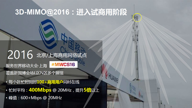 “2016年世界移動大會·上海”期間,華為配合中國移動部署的3D-MIMO就覆蓋了多個展館,忙時每小區(qū)服務(wù)100多個商用用戶的情況下,仍可以提供400Mbps以上的平均吞吐量。據(jù)中國移動透露,這項最新的4.5G 3D-MIMO技術(shù)有望在2017年上半年規(guī)模商用。大會上,華為還展示了業(yè)界首款支持3.5GHz的Massive MIMO模塊,這意味著3.5GHz的覆蓋能力和容量將得到大幅提升,近400MHz Band42/43頻譜的價值將得以最大限度釋放?! ?/p>