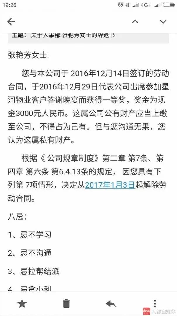 1月3日,博奧特公司行政部給張艷芳發(fā)了一封辭退郵件。郵件里稱,參加答謝會而獲得的一等獎(jiǎng)3000元屬于公司公有財(cái)產(chǎn),應(yīng)該上繳,不得占為己有。