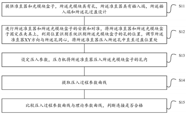 圖2是具體涉及一種光器件結(jié)構(gòu)連接方法,它主要包括以下五個(gè)步驟。首先提供準(zhǔn)直器和光模塊盒子,其中插入端和孔采用過盈設(shè)計(jì)(步驟S11)。然后進(jìn)行準(zhǔn)直器和光模塊盒子的安裝和對(duì)準(zhǔn),將準(zhǔn)直器和光模塊盒子固定在夾具上,利用位置識(shí)別系統(tǒng)識(shí)別光模塊盒子的孔的位置,調(diào)節(jié)所述準(zhǔn)直器XY方向與孔同心,將準(zhǔn)直器壓入孔中直至過盈位置處(步驟S12)。接著設(shè)定壓入?yún)?shù),壓力機(jī)將準(zhǔn)直器壓入光模塊盒子的孔內(nèi)(步驟S13)。最后提取壓入過程參數(shù)曲線并比較壓入過程參數(shù)曲線與理論參數(shù)曲線,判斷連接是否合格(步驟S14、15)。