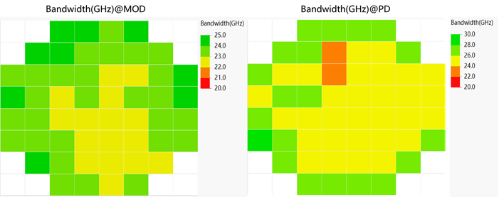 圖3展示了硅基光調(diào)制器(MOD)與鍺硅探測器(PD)的S21帶寬測試結(jié)果。本平臺可快速提取MOD和PD的頻響曲線和mapping分布,利用不同測試參數(shù)的晶圓相關(guān)性間接甄別失效,為晶圓篩選提供標(biāo)準(zhǔn)量化依據(jù),降低硅光芯片產(chǎn)品測試成本。