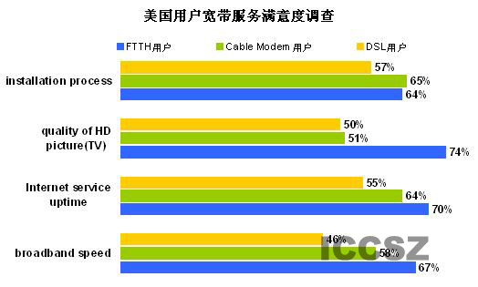 70%的FTTH用戶對他們的因特網(wǎng)服務(wù)正常運行時間感到滿意,Cable Modem為64%,DSL用戶為55%。