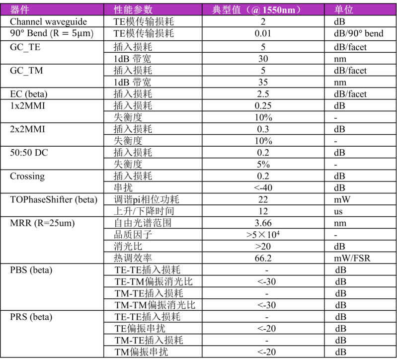 南智光電的硅光制程平臺基于180 nm CMOS工藝線,采用具有3 μm埋氧層和220 nm頂層硅的200 mm SOI襯底,能夠?qū)崿F(xiàn)無源器件、熱光調(diào)諧器件等各類硅光子器件的制作。
