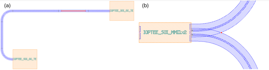 圖3:展示版圖經(jīng)由 pVerify 工具進行工藝規(guī)則檢查后的結(jié)果,檢測出(a)波導(dǎo)寬度違規(guī)(b)銳角違規(guī)