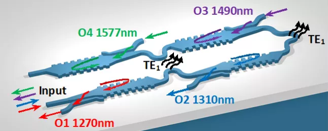 因此,亟需發(fā)展新一代片上集成四路復用-解復用器,其挑戰(zhàn)在于1310/1490/1270/1577 nm等四波長通道中心波長跨度極大且波長間隔和通道帶寬極其不均勻,采用陣列波導光柵、微環(huán)濾波器等常見結構難以實現(xiàn)。