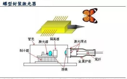 蝶形封裝:殼體通常為長(zhǎng)方體,結(jié)構(gòu)及實(shí)現(xiàn)功能通常比較復(fù)雜,可以內(nèi)置制冷器、熱沉、陶瓷基塊、芯片、熱敏電阻、背光監(jiān)控,并且可以支持所有以上部件的鍵合引線,殼體面積大,散熱好,可以用于各種速率及80km長(zhǎng)距離傳輸。