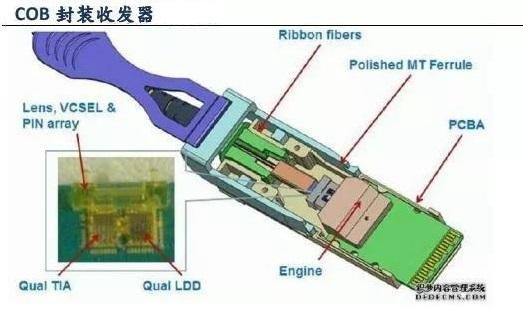 COB封裝即板上芯片封裝,將激光芯片粘附在PCB基板上,可以做到小型化、輕型化、高可靠、低成本。傳統(tǒng)的單路10Gb/s或25Gb/s速率的光模塊采用SFP封裝將電芯片和TO封裝的光收發(fā)組件焊接到PCB板上組成光模塊。而100Gb/s光模塊,在采用25Gb/s芯片時(shí),需要4組組件,若采用SFP封裝,將需要4倍空間。COB封裝可以將TIA/LA芯片、激光陣列和接收器陣列集成封裝在一個(gè)小空間內(nèi),以實(shí)現(xiàn)小型化。技術(shù)難點(diǎn)在于對(duì)光芯片貼片的定位精度(影響光耦合效果)和打線質(zhì)量(影響信號(hào)質(zhì)量、誤碼率)。