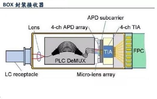 一般ROSA中封裝有分光器、光電二極管(將光壓裝換成電壓)和跨阻放大器(放大電壓信號(hào)),TOSA中封裝有激光驅(qū)動(dòng)器、激光器和復(fù)用器。