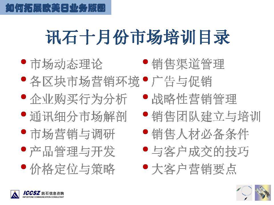 為更好的服務(wù)會(huì)員,擴(kuò)大會(huì)員權(quán)益范圍,訊石從本月開始特增加會(huì)員培訓(xùn)課程(原會(huì)員服務(wù)條款中不包括),本月訊石特推出的十月市場銷售培訓(xùn)課程為《如何拓展歐美日業(yè)務(wù)版圖》,專為會(huì)員企業(yè)中高層市場和銷售管理層人員定制,由訊石董事長石明先生親自講解。訊石會(huì)員將有三個(gè)免費(fèi)名額。報(bào)名聯(lián)系:0755-82960080-103 Cathy cathy@iccsz.com
