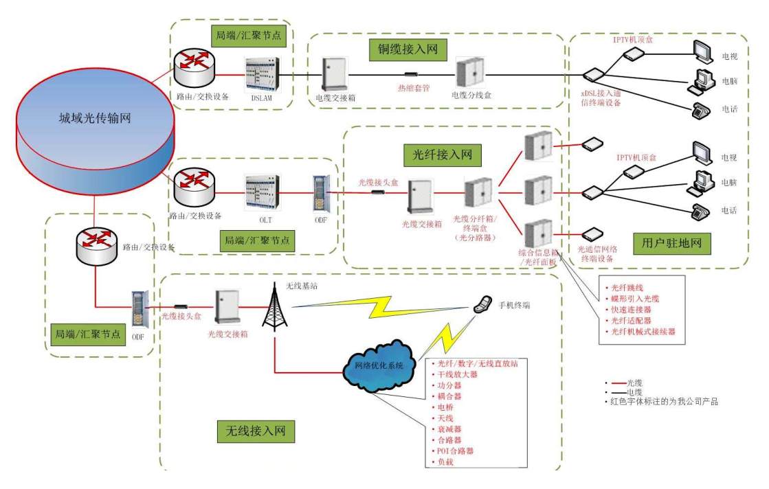 ①直放站、②干線放大器、③功分器、耦合器、合路器等、④室內(nèi)分布天線、⑤移動通信網(wǎng)絡(luò)優(yōu)化系統(tǒng)集成服務(wù)