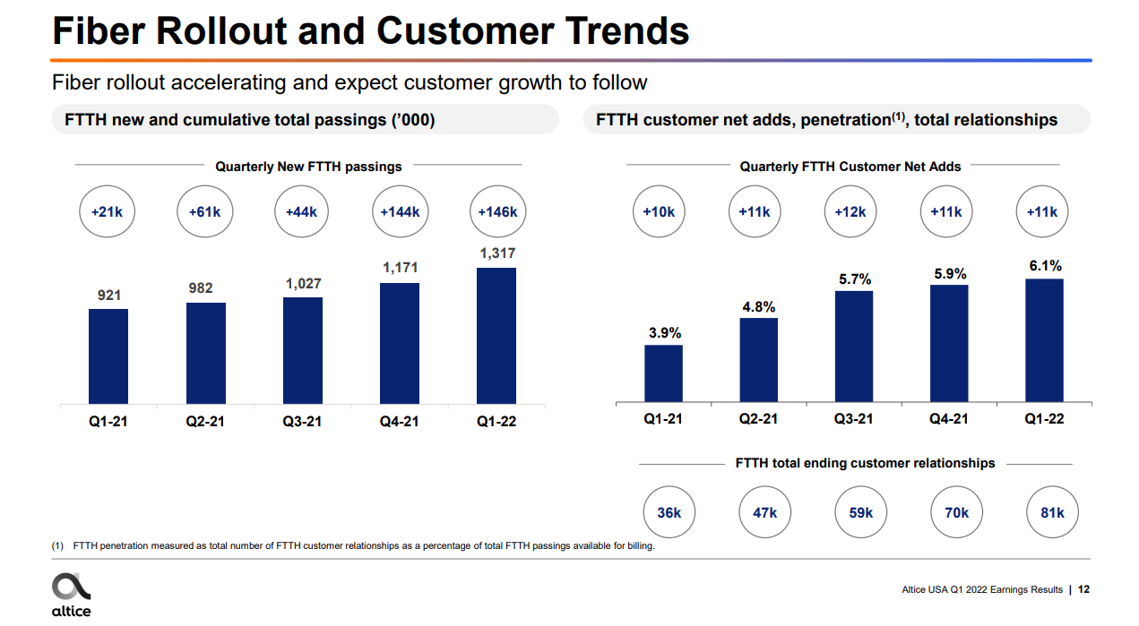 Altice USA 的光纖用戶增長更新也隨之到來,因為該公司希望扭轉(zhuǎn)最近的寬帶用戶損失。 Altice USA 在 2022 年第一季度失去了 13,000 名住宅寬帶用戶,但相信其光纖戰(zhàn)略將導(dǎo)致下半年寬帶用戶增長。