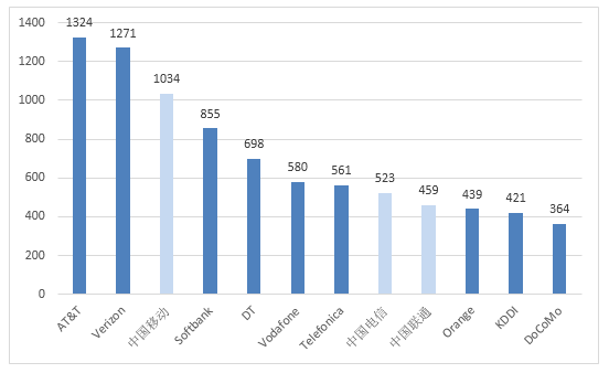 圖1 2014年主要電信運營商業(yè)務收入規(guī)模(單位:億美元)