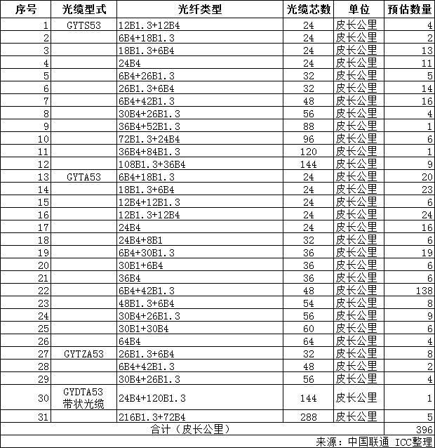 采購(gòu)內(nèi)容:各種型號(hào)混纜預(yù)估397皮長(zhǎng)公里,具體采購(gòu)內(nèi)容見(jiàn)下表:
