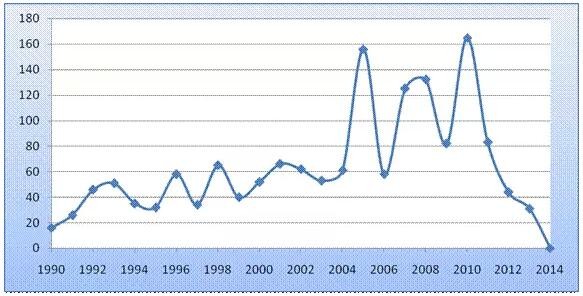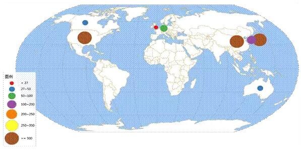 圖1揭示了全球可見光通信專利申請的年度趨勢,從圖中可以看出,可見光通信技術(shù)的發(fā)展可以分為三個階段,從20世紀(jì)90年代開始,可見光通信技術(shù)專利開始布局,1990年的專利申請數(shù)量為16項,1990-1993年,專利申請數(shù)量呈現(xiàn)小范圍的持續(xù)增長。1994-2004年,可見光通信專利數(shù)量呈現(xiàn)波動性變化,年專利申請數(shù)量維持在30-60之間。2005年之后,可見光通信技術(shù)專利申請數(shù)量有大幅增長,最高年專利申請數(shù)量超過100項,但是波動性仍然很大。