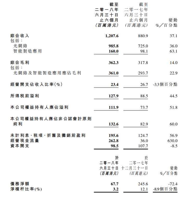主要原因:數(shù)據(jù)中心互連市場發(fā)展強勁,繼續(xù)帶動增長;在原有客戶和數(shù)個新客戶方面取得更大的業(yè)務(wù)份額;有源光元器件銷售收入大幅增長75%至約1億港元;及客戶現(xiàn)正為5G網(wǎng)絡(luò)部署產(chǎn)品進(jìn)行認(rèn)證。由于快將推出的5G網(wǎng)絡(luò)部署計劃將會進(jìn)一步推高光網(wǎng)絡(luò)產(chǎn)品的需求以及推動有關(guān)產(chǎn)品的升級周期,顯示不久的將來將會有新增收入來源。
