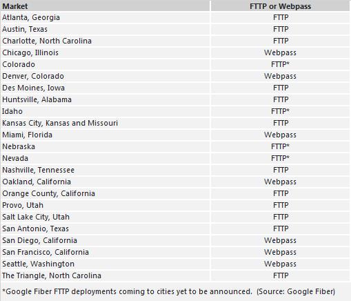 以下是谷歌光纖使用FTTP或其固定無線平臺Webpass,進行和計劃中的網絡和服務部署情況: