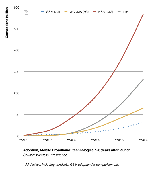90年代中期,GSM問世,和GSM前六年的發(fā)展相比,WCDMA HSPA的普及率為GSM的6-10倍?,F(xiàn)在每月增加的HSPA連接達(dá)1900萬,到2012年底總量會(huì)達(dá)到10億。到2015年,LTE連接會(huì)達(dá)到3億。