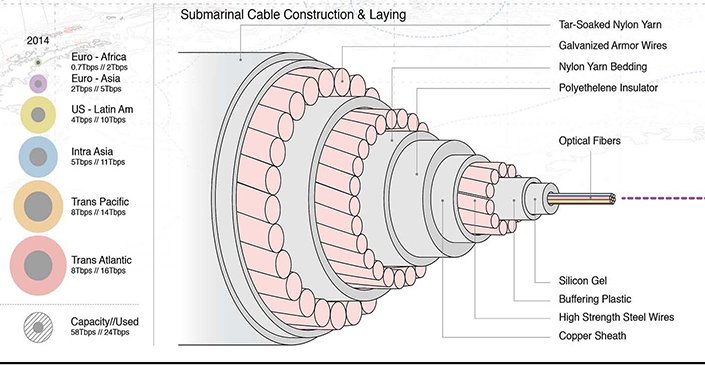 根據(jù)統(tǒng)計,當前運營中的海底通訊電纜數(shù)量超過420個,總長度超過110萬千米。這些電纜系統(tǒng)大都聚集在新加坡、紐約等信息經(jīng)濟熱點地區(qū),但通訊電纜已經(jīng)延伸到世界任何地方,不論是偏遠的太平洋島嶼,還是北極圈的小鎮(zhèn)。