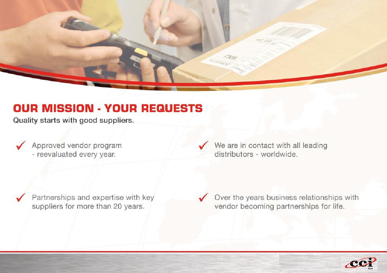 Booking Services長期供貨-代理和分銷產(chǎn)品; Spot Buy緊急供貨:現(xiàn)貨服務(wù); Third Party purchase代買服務(wù); Stock Buy Back呆滯庫存處理; VMI 備貨交貨.
