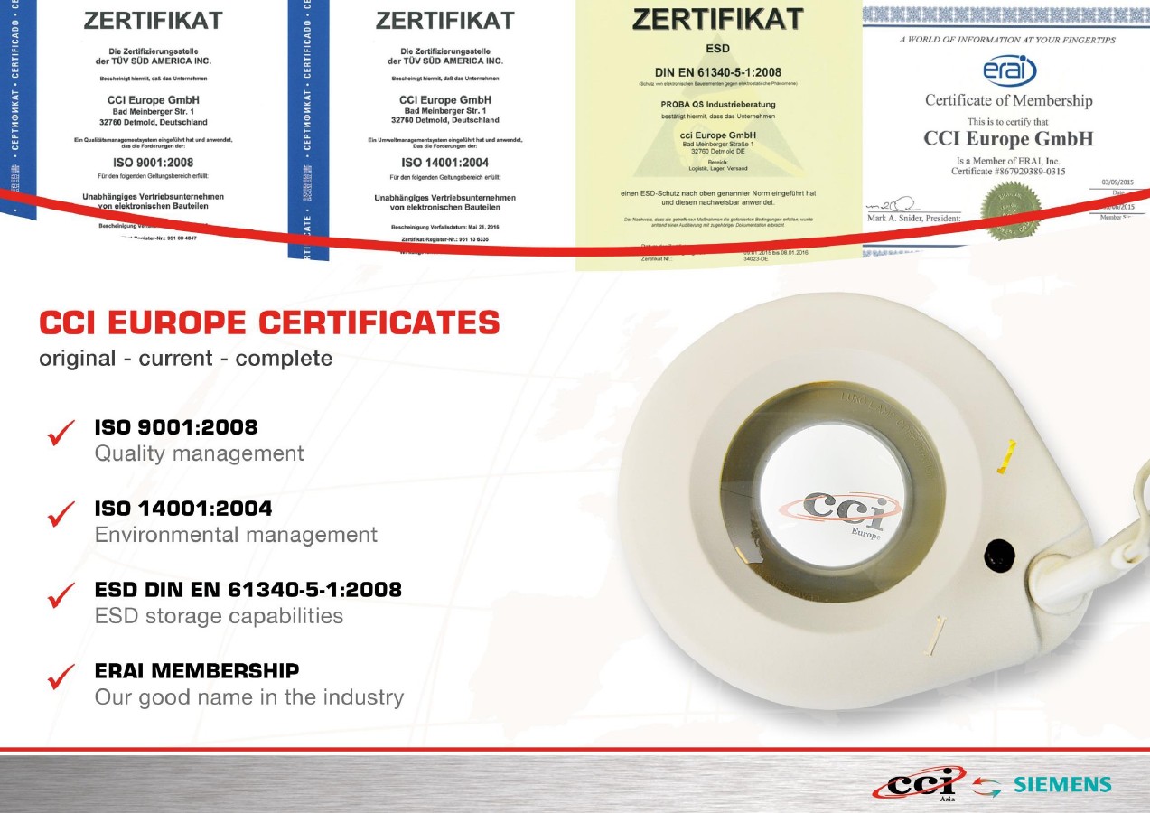 ISO9001:2008,ISO14001:2004,AS9120:2009,ANSI/ESD S20.20:2007,RoHS Certified, ERAI,1000萬元產(chǎn)品質(zhì)量責(zé)任險賠償能力