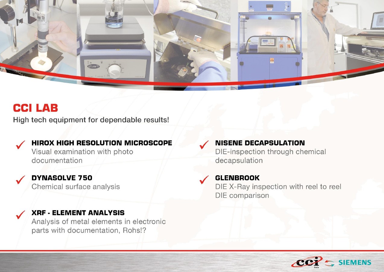Our Lab Capability我們實驗室的測試能力:Components Authentication器件真?zhèn)悟炞C; X-RAY內(nèi)部穿透測試; D-Cap剖片測試; XRF環(huán)保測試; Solderability 可焊性測試; Tape & Reel卷帶; Baking烘烤.