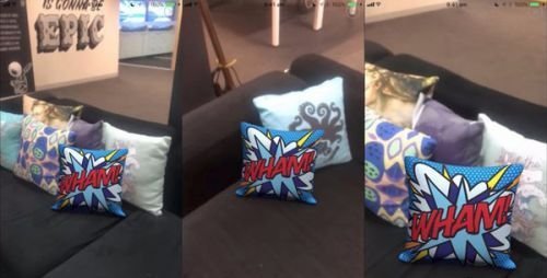 通過這個AR軟件,用戶可以從商店中選擇抱枕,然后打開iPhone攝像頭,在沙發(fā)上點擊需要擺放的地方,抱枕便會放到相應的位置,還可以360度觀看抱枕是否與沙發(fā)和其他物件搭配。
