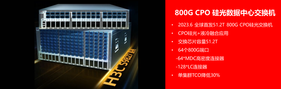 AIGC的持續(xù)升溫和大規(guī)模的算力運行,使得數(shù)據(jù)中心的“能耗焦慮”日益加劇,高速互聯(lián)下的綠色數(shù)據(jù)中心的建設(shè)也成為了未來的發(fā)展趨勢。早在2023年6月,新華三就發(fā)布了全球首款基于51.2T交換容量的800G CPO硅光數(shù)據(jù)中心交換機,為智算網(wǎng)絡(luò)部署全面降溫。