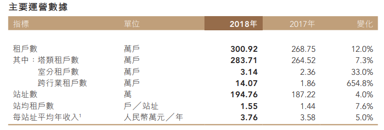 報告期內(nèi),中國鐵塔資本開支(CAPEX)為264.66億元,同比下降39.6%。運(yùn)營方面,2018年中國鐵塔累計站址數(shù)達(dá)194.76萬,同比增長4%,站均租戶數(shù)1.55戶,同比增長7.6%。整體共享率水平持續(xù)提升。