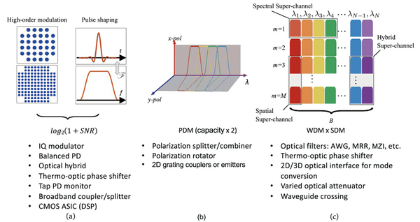 圖2 各種提高整體傳輸速率的方法及所需的元件,(a)光同調(diào)傳輸,(b)極化多工傳輸,(c)空間分割多工與分波多工的整合傳輸 (Ref. Wei Shi, et al. Nanophotonics)。
