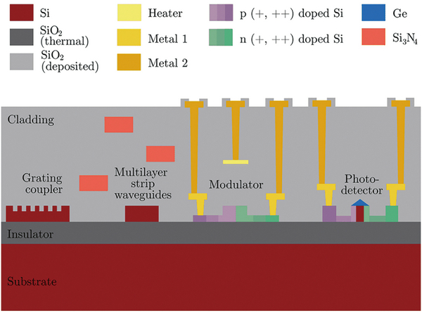 圖3 硅光子SOI晶圓剖面示意圖,紅色基板為硅,灰色絕緣層可作為下蓋光層,中間層為各式光元件,上層淺灰色為上蓋光層,黃色為導(dǎo)電金屬電極(Ref. Wei Shi, et al. Nanophotonics)。