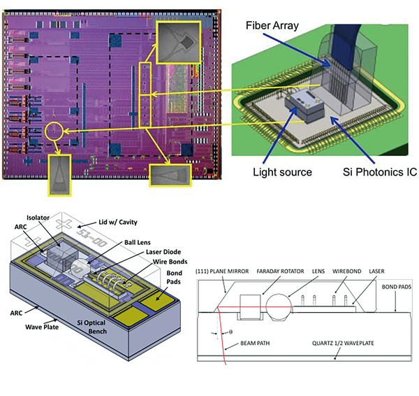 圖6 Luxtera硅光子芯片及模組示意圖,(上)硅光子芯片用于耦合雷射光的光柵耦合器及組裝示意;(下)鐳射光源的細部結(jié)構(gòu)與光路徑示意。