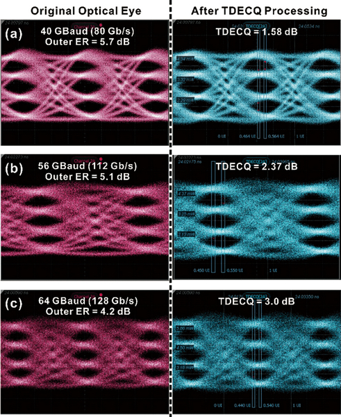 Intel則于2019年發(fā)表單通道128Gb/s PAM4的MRM元件,該元件小訊號頻率響應(yīng)測得之-3dB頻寬達50GHz,同時整合微加熱器以優(yōu)化元件性能,如圖15所示。該元件操作在最高速率64GBaud PAM4時,其輸出光眼圖TDECQ為3dB、ER值約為4.2dB,如圖16所示。