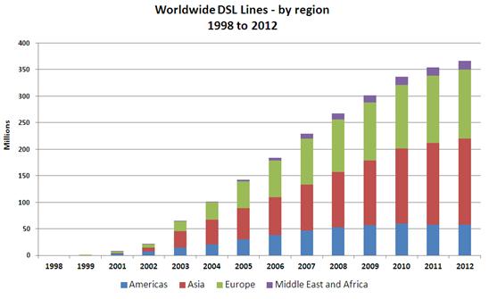 調(diào)研公司Point Topic近日公布數(shù)據(jù)稱,全球DSL連接數(shù)去年第四季度首次出現(xiàn)下滑,降至約3.67億,但綜合來看,目前DSL仍占全球?qū)拵нB接總數(shù)的57%。