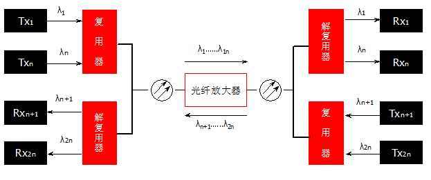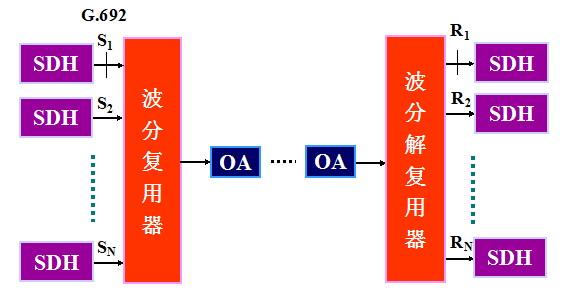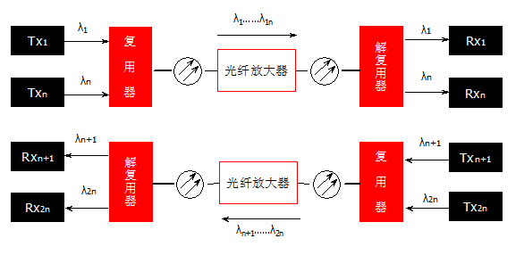 WDM系統(tǒng)主要由以下五個部分組成:光發(fā)送機、光中繼放大、光接收機、光監(jiān)控信道和網絡管理系統(tǒng)。WDM系統(tǒng)總體結構示意圖如圖所示。