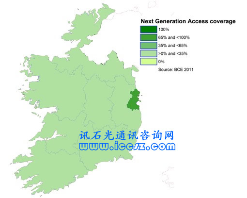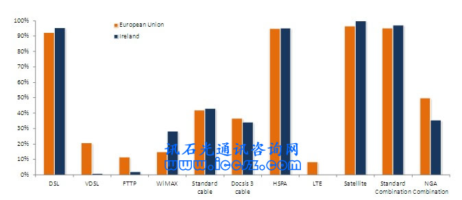 《2011歐洲寬帶覆蓋》調(diào)研報(bào)告顯示,愛(ài)爾蘭基本寬帶(至少提供144kbps的服務(wù),只要他們?cè)敢猓┘彝ジ采w達(dá)到97%,超高速寬帶覆蓋接近36%(也稱(chēng)為NGA,即下一代接入)。在調(diào)研的29個(gè)國(guó)家中(歐盟27國(guó)和挪威、冰島),96%能夠獲得基本寬帶,超過(guò)50%(一半國(guó)家走向2020數(shù)字天堂目標(biāo))能夠獲得超高速。