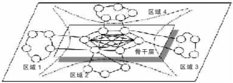 上世紀(jì)90年代末,朗訊推出了容量為512個(gè)VC-4的DXC4/4/1設(shè)備,為了解決環(huán)間電路間的靈活調(diào)度,提高資源利用率,上海電信引入了WaveStar DXC4/4/1設(shè)備,作為在骨干節(jié)點(diǎn)上環(huán)間連接的樞紐設(shè)備,而此時(shí)的骨干層主要采用的是10G二纖(或四纖)雙向復(fù)用段保護(hù)自愈環(huán),區(qū)域?qū)又饕捎玫氖?.5G二纖雙向復(fù)用段保護(hù)自愈環(huán)。其網(wǎng)絡(luò)結(jié)構(gòu)如右圖所示。