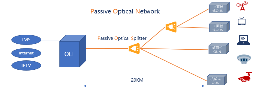 POL采用PON技術(shù);PON(Passive Optical Network)是一種點(diǎn)到多點(diǎn)(P2MP)結(jié)構(gòu)的無源光網(wǎng)絡(luò),其組成涵蓋三部分:OLT, ODN, ONU