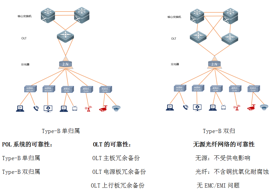 POL采用PON方案架構(gòu),OLT部署在核心機(jī)房,從核心機(jī)房到用戶,中間層采用無源分光器,無需獨(dú)立機(jī)房部署,無需供電,減少了有中間有源設(shè)備故障點(diǎn),ONU靠近用戶,通過銅線連接用戶。POL全光網(wǎng)絡(luò)廣泛應(yīng)用于大中小型企業(yè)、政府機(jī)關(guān)、科技園區(qū)/工業(yè)園區(qū)、學(xué)校、醫(yī)院以及需要在內(nèi)部進(jìn)行局域/本地寬帶聯(lián)網(wǎng)的各種場景,按照其業(yè)務(wù)需求、組網(wǎng)規(guī)模各有不同。