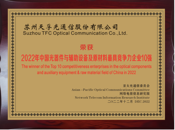 近日,由亞太光通信委員會和網絡電信信息研究院聯合主辦的2022全球|中國光通信最具競爭力企業(yè)10強榜單線上重磅發(fā)布,蘇州天孚光通信股份有限公司(以下簡稱“天孚通信”)連續(xù)五年榮登榜單,蟬聯2022年中國光器件與輔助設備及材料最具競爭力企業(yè)10強,充分體現了天孚通信在光通信行業(yè)細分領域的領先地位。