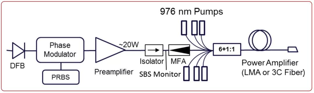2018年,密歇根大學(xué)聯(lián)合nLight公司,由M. Kanskar和A. Galvanauskas等人分別運(yùn)用Yb20/400/0.064 DC LMA光纖和Yb 21.9/400/0.059 DC3C光纖對(duì)單頻線偏振種子源進(jìn)行功率放大,泵浦源為鎖波長(zhǎng)976nm模塊,分別實(shí)現(xiàn)了2.4kW和2.6kW[8]。種子源為1064nmDFB通過(guò)相位調(diào)制器進(jìn)行偽隨機(jī)信號(hào)調(diào)制適當(dāng)展寬線寬。MFA實(shí)現(xiàn)全光線結(jié)構(gòu)。當(dāng)種子源20GHz時(shí),實(shí)驗(yàn)中Yb20/400LMA光纖在2.2kW時(shí)出現(xiàn)了TMI,而3C光纖彎曲直徑30cm,在抑制高階模的同時(shí)在2.6kW時(shí)沒(méi)有TMI產(chǎn)生。