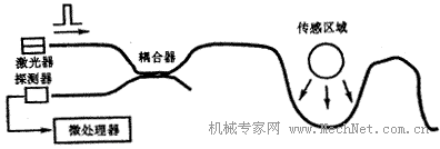 該傳感器的一般形式是,光的入射與探測分別處于光纖的兩端.如果傳感光纖支持不同傳播速度的兩種傳輸模,那么在一定外界條件的作用下,光纖本征傳輸模的一部分能量就會耦合到另一傳輸模。因此在光纖另一端輸出的耦合模的強(qiáng)度就能反映出被測量的大小,兩傳輸模之間的延遲時間則反映出耦合點的位置。