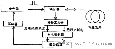因而這一關(guān)系與光時域反射技術(shù)結(jié)合就可構(gòu)成分布式溫度傳感器。圖2是該類傳感器的基本結(jié)構(gòu)框圖。采用斯托克斯光與反斯托克斯光的強(qiáng)度比可消除光纖的固有損耗和不均勻性所帶來的影響。