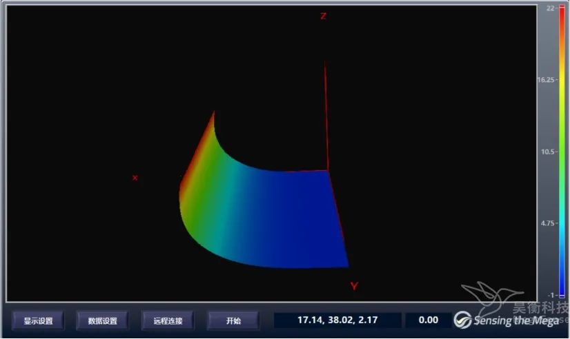 為展示新功能,昊衡科技向大家演示了板狀結(jié)構形變監(jiān)測與空間形態(tài)實時檢測。團隊在板狀結(jié)構表面布設分布式光纖傳感器,結(jié)合自研OFDR設備(OSI)高分辨、高精度、分布式傳感特性,獲得板狀結(jié)構上各處應變信息,并建立應變和空間曲率算法,實現(xiàn)了板狀結(jié)構空間形態(tài)擬合與重構。