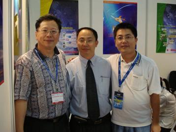 石總與華潤(rùn)通總經(jīng)理鐘文欽(左二)、上海上詮副處長(zhǎng)韓鳳永(右一)在上海上詮展臺(tái)前合影